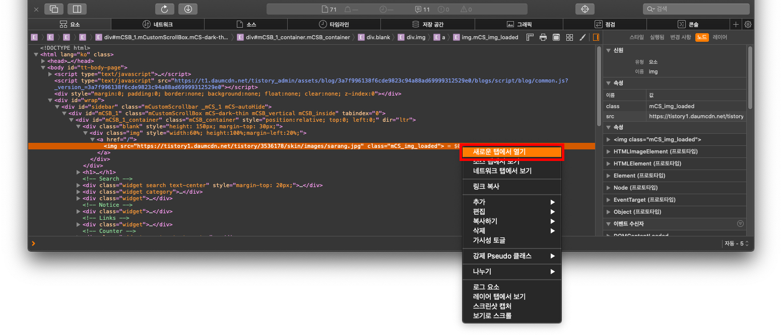 이미지 클릭 시 선택되는 코드 속 링크를 우클릭하여 '새로운 탭에서 열기' 합니다. ▲