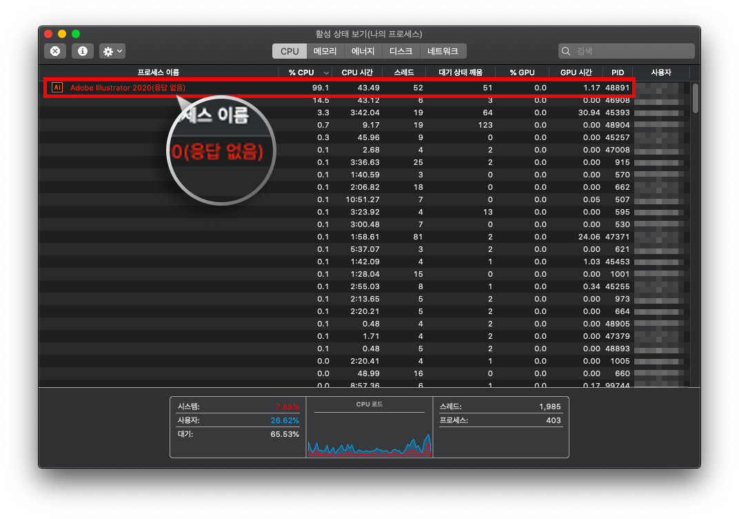 맥을 사용하다 보면 윈도우와 마찬가지로 프로그램이 작동을 멈추는 일이 발생합니다. 프로그램 내부적인 출동이 원인일 수도 있고, 영상 편집을 할 경우 고해상도의 영상을 렌더링 하거나 Relfaction 같은 효과를 많이 사용하면 메모리 사용이 많아지고 CPU 부하가 생기며 마우스 커서가 무지개색 원으로 변하는 모습을 한 번씩 경험하셨을 겁니다.