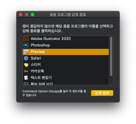단축키 cmd(⌘) + option(⌥) + esc 를 눌러 바로 실행이 가능합니다.
