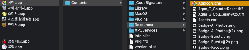 Finder에서 응용프로그램에 들어가 사진.app 을 우클릭하여 '패키지 내용 보기' 에 들어가 줍니다. ▲