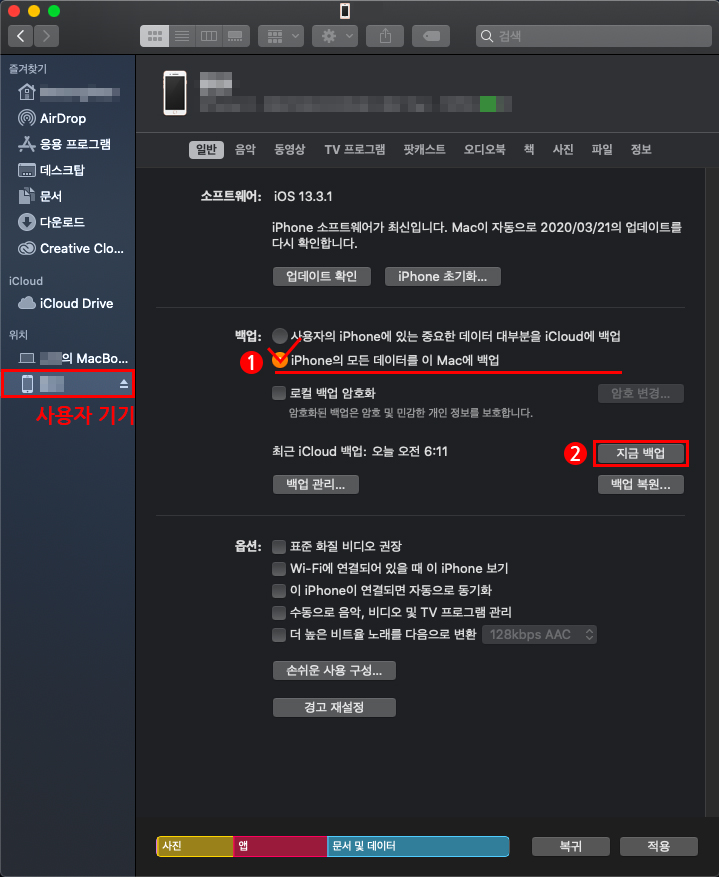 백업을하려면 먼저 'iPhone의 모든 데이터를 이 Mac에 백업'에 체크를 해주신 다음 '지금 백업'을 누르시면 됩니다. ▲